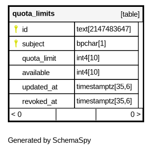 | quota_limits_pkey | Primary key | Asc/Asc | id + subject |